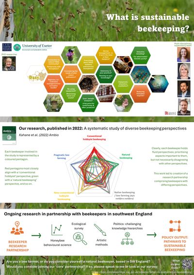 Different honeybee management practices impact honeybees and wild pollinators in different ways. Similarly, different beekeeping / land management policies and practices impact beekeepers in different ways. Having built a beekeeper-researcher partnership based in SW England, I am facilitating this partnership to design, undertake and analyse fieldwork to explore what ‘sustainable beekeeping’ means, and how we can/should translate this into action.